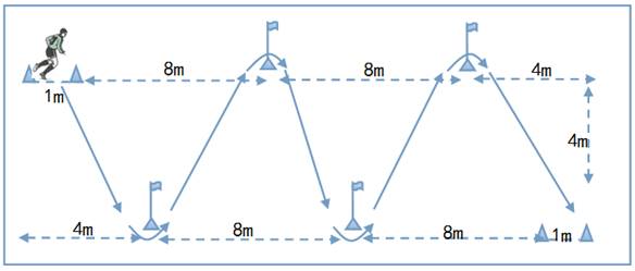 测试方法:听测评员口令后,从起始线开始运球出发,依次绕过间隔不等的8个标志杆,以球踩终点线为结束。