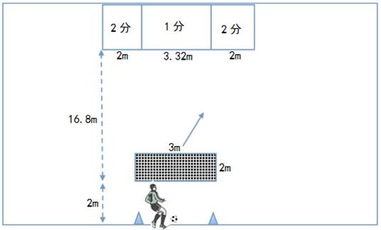 测试场地:平整的人工草或天然草足球场罚球区或足球墙,射门区距球门或足球墙