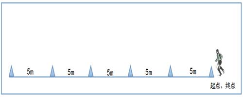 测试方法:听测评员口令后,以站立式起跑姿势从起始线开始加速跑,依次绕过间隔
