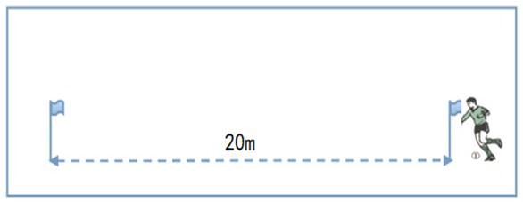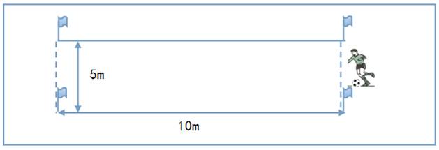 测试方法:听测评员口令后,从起始线运球进入射门区域后,进行正脚背射门。每人踢五个球。