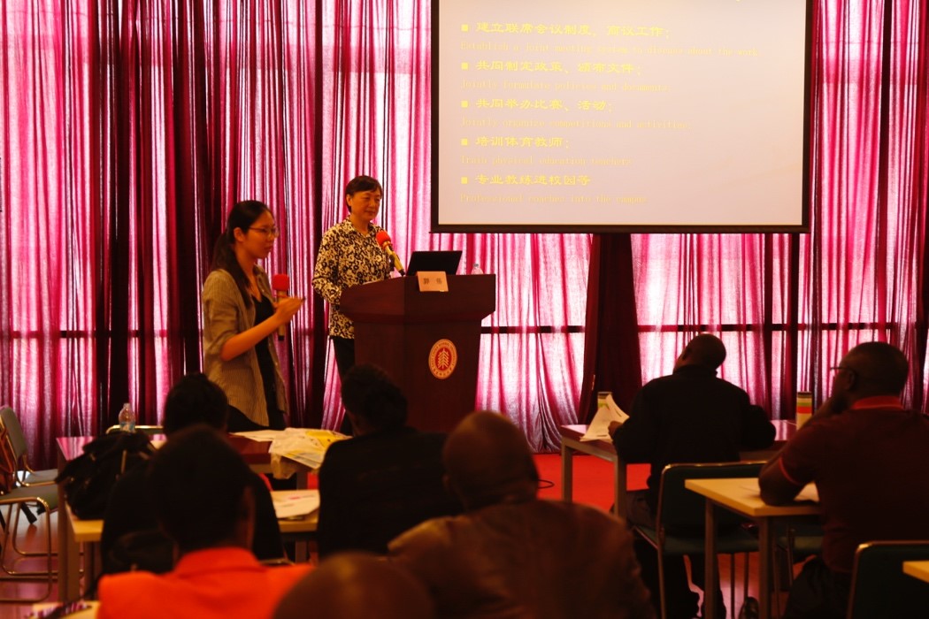 在本土学术讲座与实践考察的基础上,为了进一步拓宽学员的国际视野,主办方还安排了大量的国际交流活动。研修期间,学员们先后聆听了加拿大英属哥伦比亚大学的Jeanne Kentel教授、美国密歇根大学Weiyun Chen教授、美国坎纳绍州立大学Jin Wang教授、特拉华州立大学Li Chen教授、意大利拉斐尔大学Alberto Cei教授等国际著名青少年体育与体育教育专家的多场高水平讲座,与专家进行了充分交流,了解了世界各个地区的教育发展趋势和青少年体育发展经验。尤其是Jeanne Kentel和Weiyun Chen两位教授有关青少年体质健康发展和学校体育教学问题的讲座与交流,让全体学员耳目一新,受益匪浅。此外,主办方还在最后一天为学员们精心准备了充满中国风味的送别会,让他们更深地体会到了中国传统文化的热情与好客。这些国际交流活动,为他们今后开展国际合作创造了很好的平台,为赞比亚与其它国家的体育工作交流奠定了良好的基础。