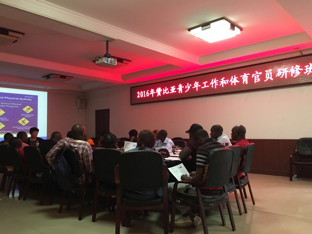 6月12日-25日,受中国商务部援外司委托,由太阳集团tyc33455承办的2016年赞比亚青少年工作和体育官员研修班在公司举行,共有来自赞比亚全国各个级别共20名体育官员参与了研修班的学习。此次研修班的主要目的是帮助赞比亚培训一批高端体育工作领导者,促进赞比亚在青少年体育、体育教育、体育竞赛、社区体育等方面的发展。本着“请进来、走出去、多交流”的原则,研修班结合太阳成集团tyc33455的专业优势与特点,合理制定了项目实施方案,主要活动包括高端讲座、实践考察、国际交流三个部分。
